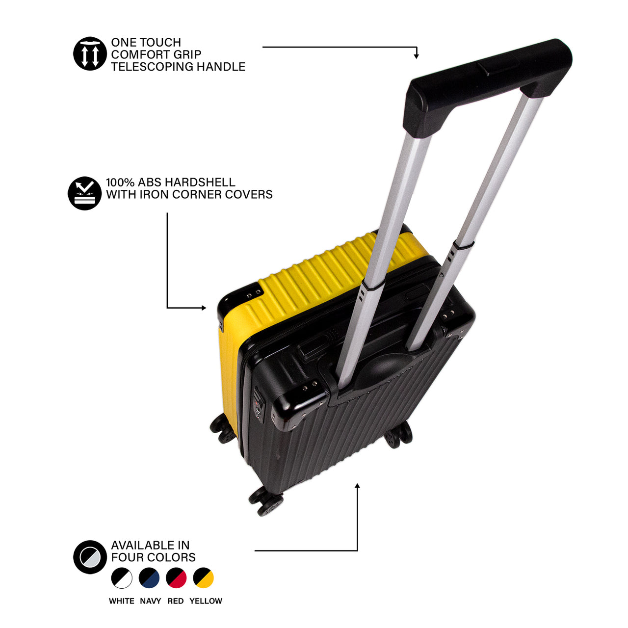 The Premium Carry-On Hardcase Spinner has 2 colors making the case distinctive and highly visible. Iron corner covers provide protection to avoid damages. 360 degree spinner wheels provide exceptional maneuverability and smooth rolling in any direction. TSA combination lock provides extra protection. The 100% ABS construction absorbs impact. Fully lined interior features two main packaging compartments, zipper pocket and tie-down elastic straps to hold your clothes in place.
