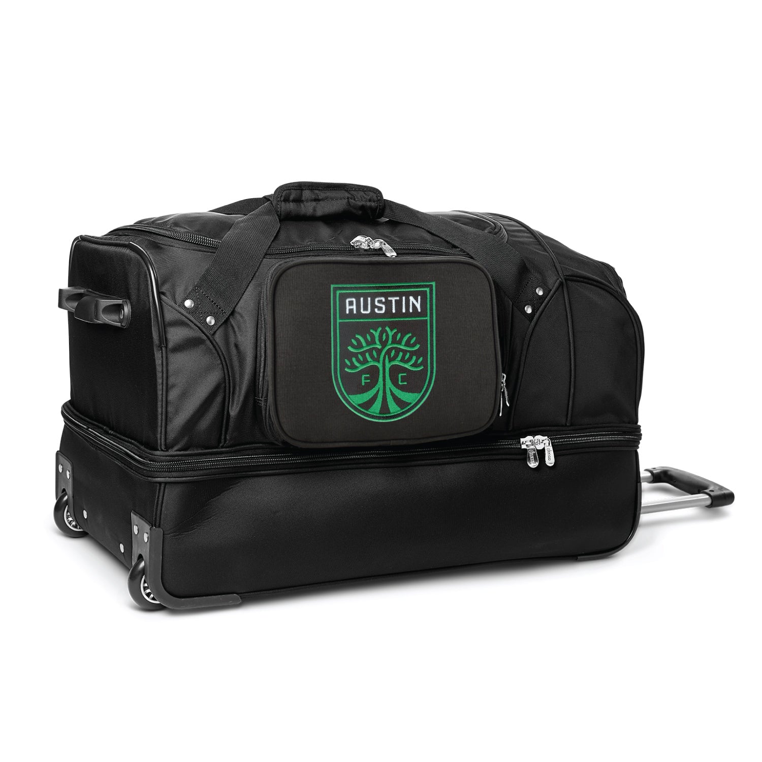 The 27" Black Rolling Drop Bottom Duffel boasts a spacious, structured and lined main compartment with a convenient, u-shaped, top-zip closure. This bag features grab handles on both ends to allow two-handed trunk-style lifting into vehicles. A dual zipper reinforced drop bottom allows for more secure and organized packing with the convenience of the duffel shape. Finally, this officially licensing duffel comes with protected in-line skate wheels ensuring the quietest travels on the concourse.