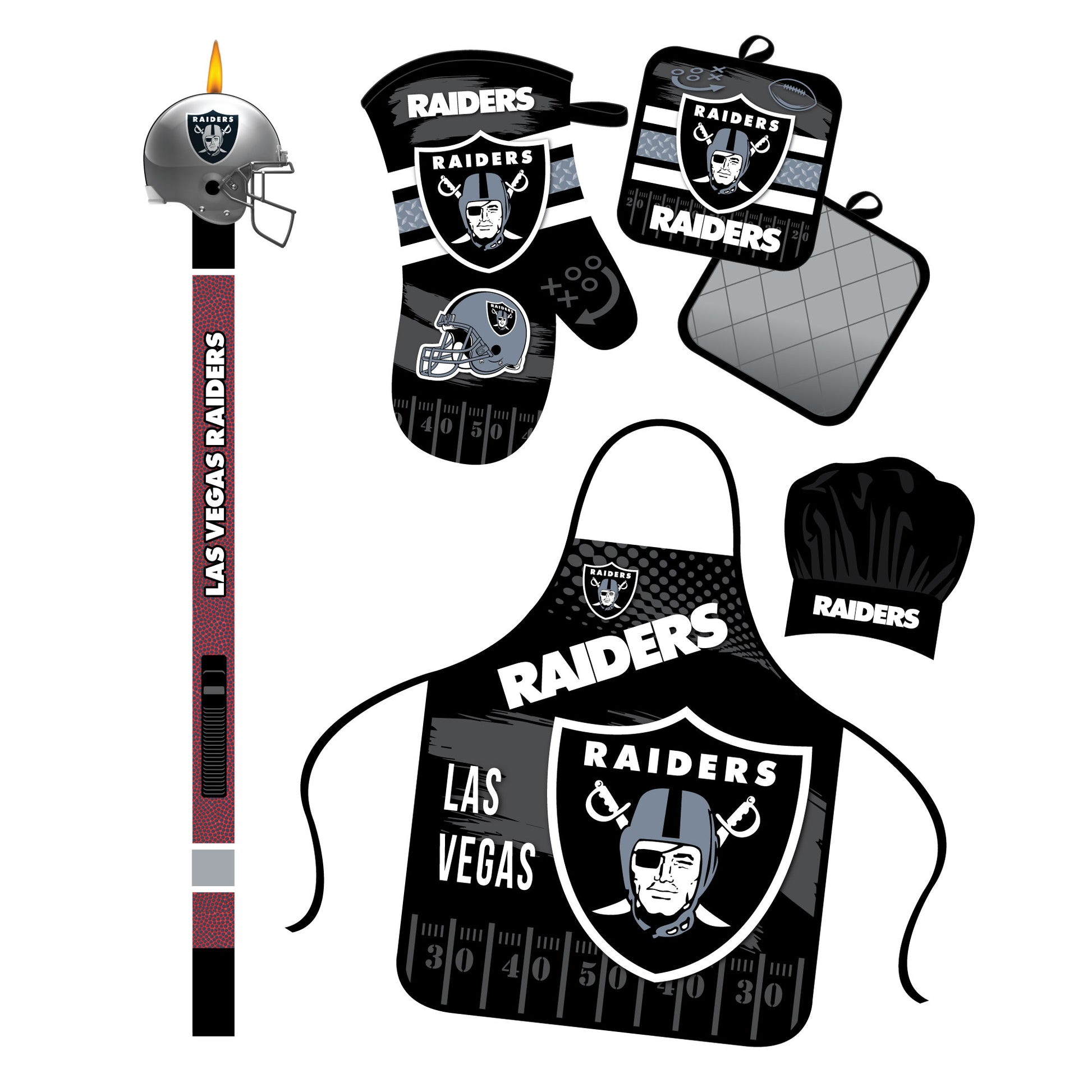 This Las Vegas Raiders BBQ Bundle has everything you need to show off your team spirit at your next cookout! Including an apron/chef hat set, oven mitt/potholder, and BBQ lighter This kit is perfect for any fan. Upgrade your grilling game with this fan-favorite bundle.